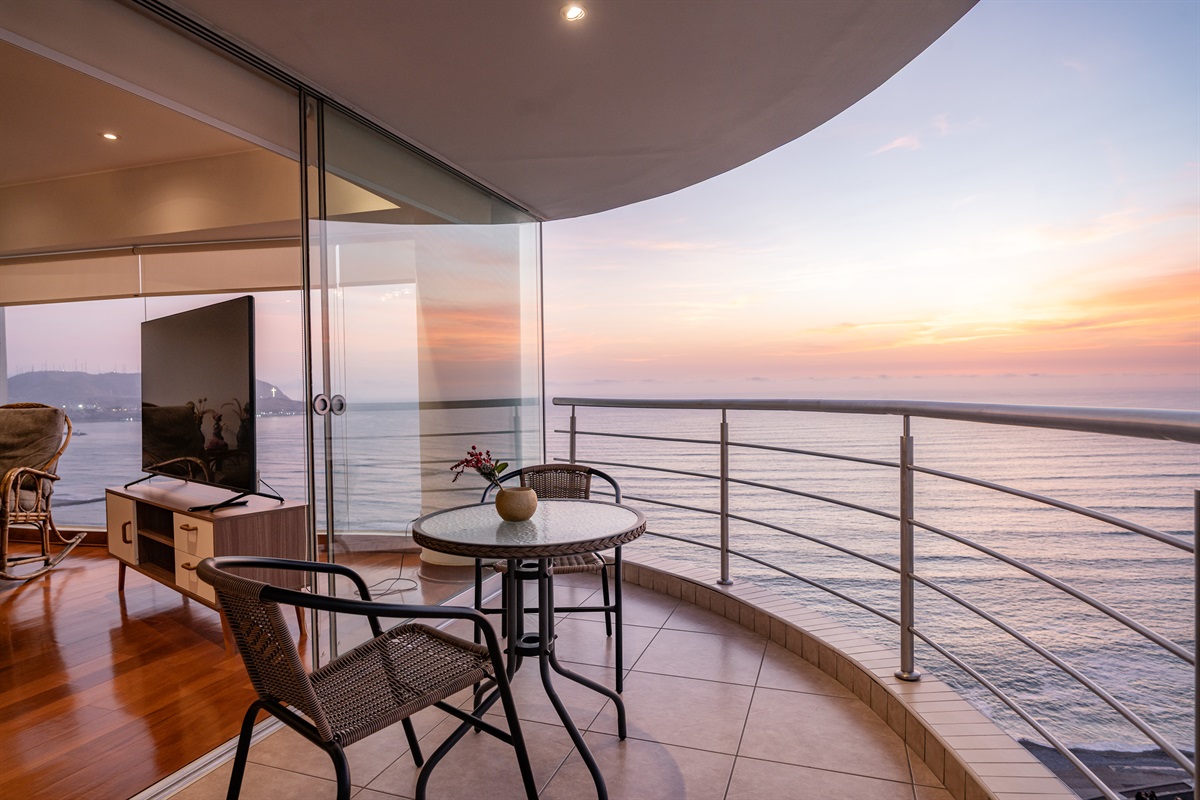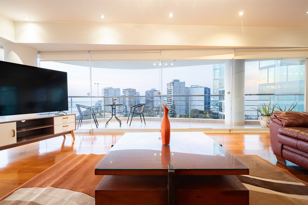 (Photo taken from apartment) View from the living room at evening. World-Class Sunsets: Your private front-row seat to the most magical golden hours in Lima, right from your unique curved balcony