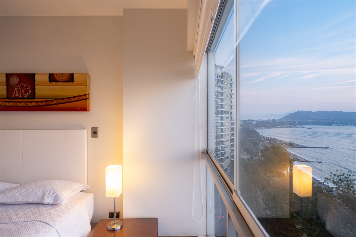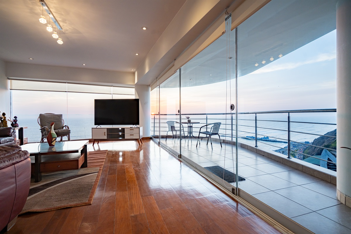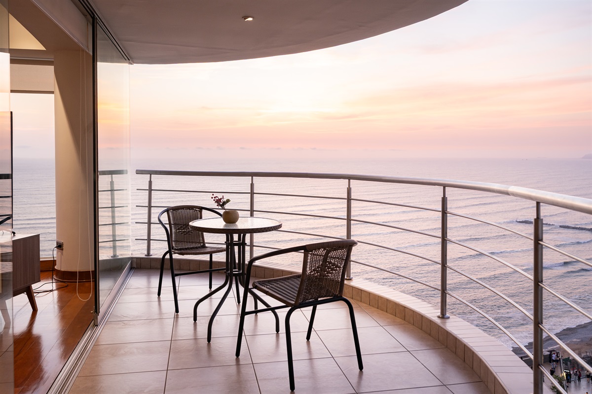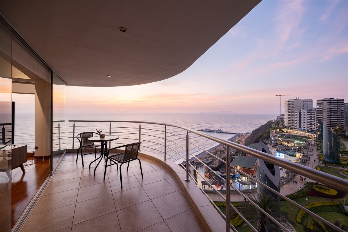 (Photo taken from apartment balcony) View from the living room at evening. World-Class Sunsets: Your private front-row seat to the most magical golden hours in Lima, right from your unique curved balcony
