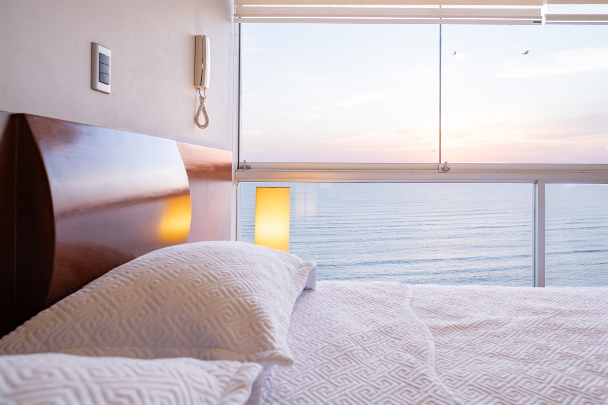King bedroom with stunning sea and Malecón views β wake up inspired every morning ( (Photo taken from apartment bedroom) / Dormitorio con cama king y una vista impresionante al mar y al malecón (foto tomada desde habitación)