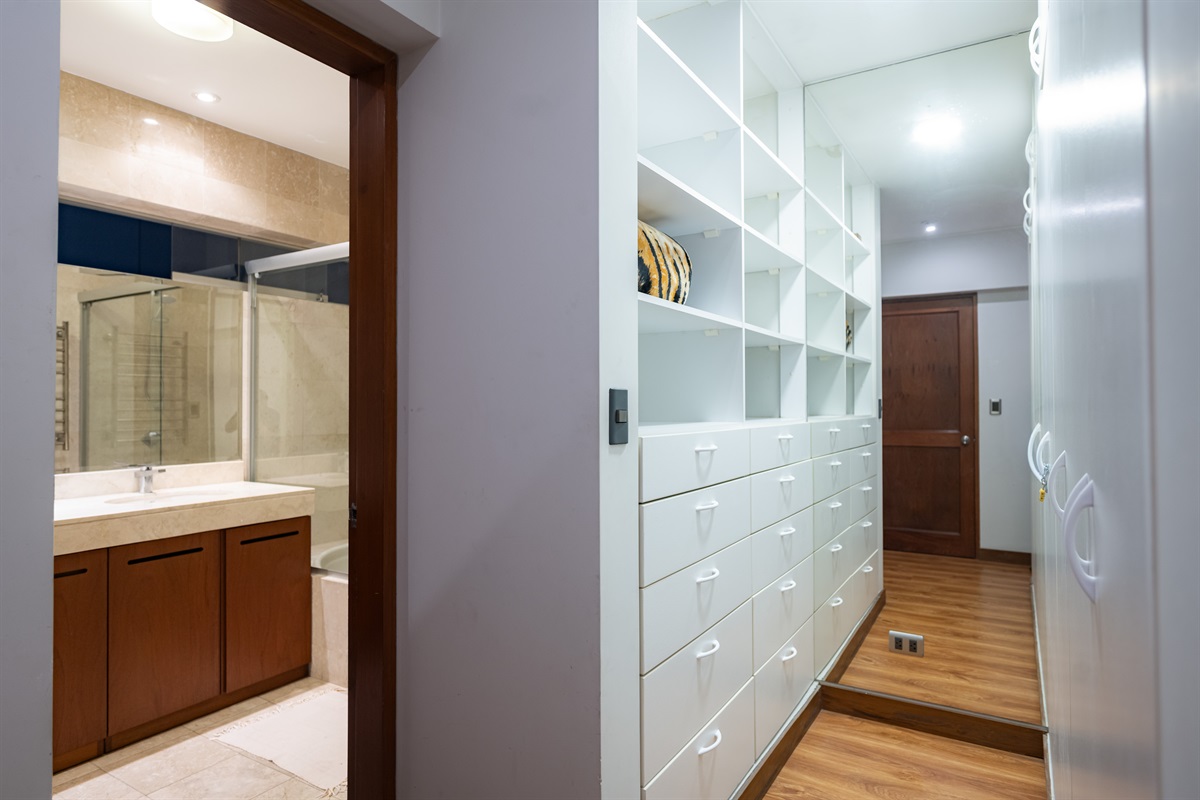 Spacious walk-in closet in the master bedroom β perfect for organizing your stay / Amplio walk-in closet en el dormitorio principal β ideal para mantener todo en orden durante tu estadía